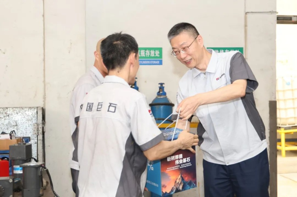 “大家辛苦了!感谢大家!”在二三分厂、公辅保障中心废气治理站、磊石公司(总部制造基地),杨国明总裁非常关心员工的生产环境,关切询问高温天气下的工作时长、轮班安排、后勤保障等情况,要求各单位做好防暑降温工作,保障生产稳定运行。